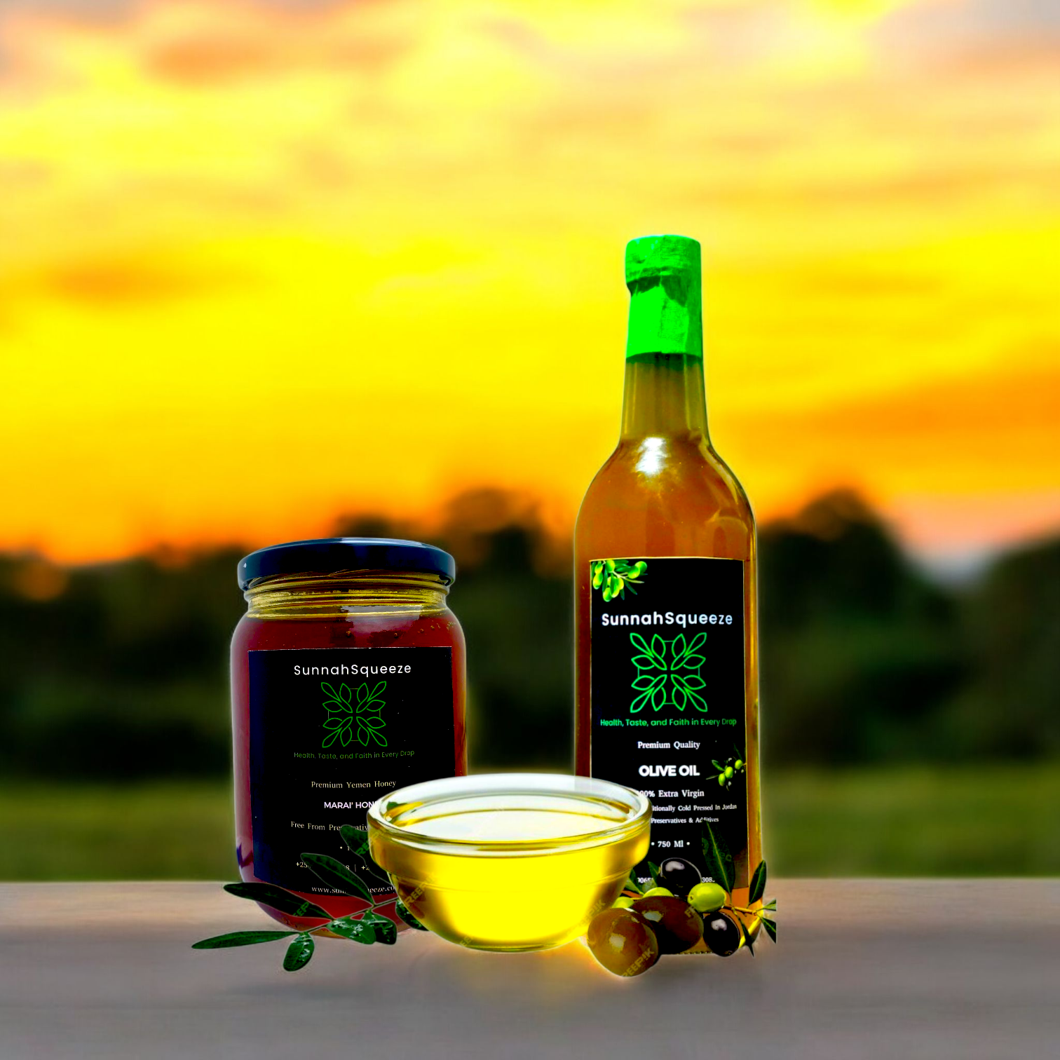 Indulge in our premium olive oil, honey, and pomegranate molasses crafted with care.